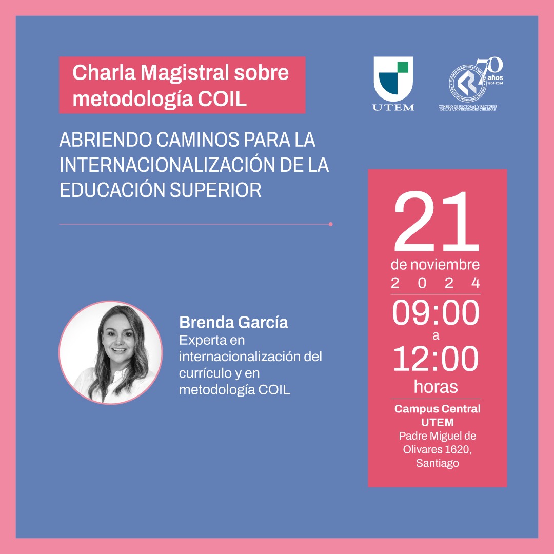 La Universidad Tecnológica Metropolitana y su Dirección de Asunto Nacionales e Internacionales (DANeI) invitan a participar en la «Charla Magistral sobre Metodología COIL» que ofrecerá la experta Brenda García.