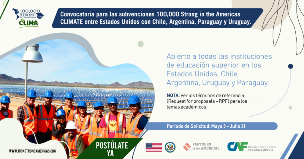 La Oficina de Asuntos Internacionales, en conjunto con la Dirección General de Investigación, Innovación y Emprendimiento, los invitan cordialmente a presentar sus propuestas para participar en la Convocatoria de Subvenciones 100K CLIMA para Crear Programas Inclusivos de Acción Climática e Intercambio Estudiantil entre Estados Unidos, Argentina, Chile, Paraguay y Uruguay (2023) ofrecida por el Fondo de Innovación 100,000 Strong in the Americas: Alianza 100K para la Acción Climática (100K CLIMA).