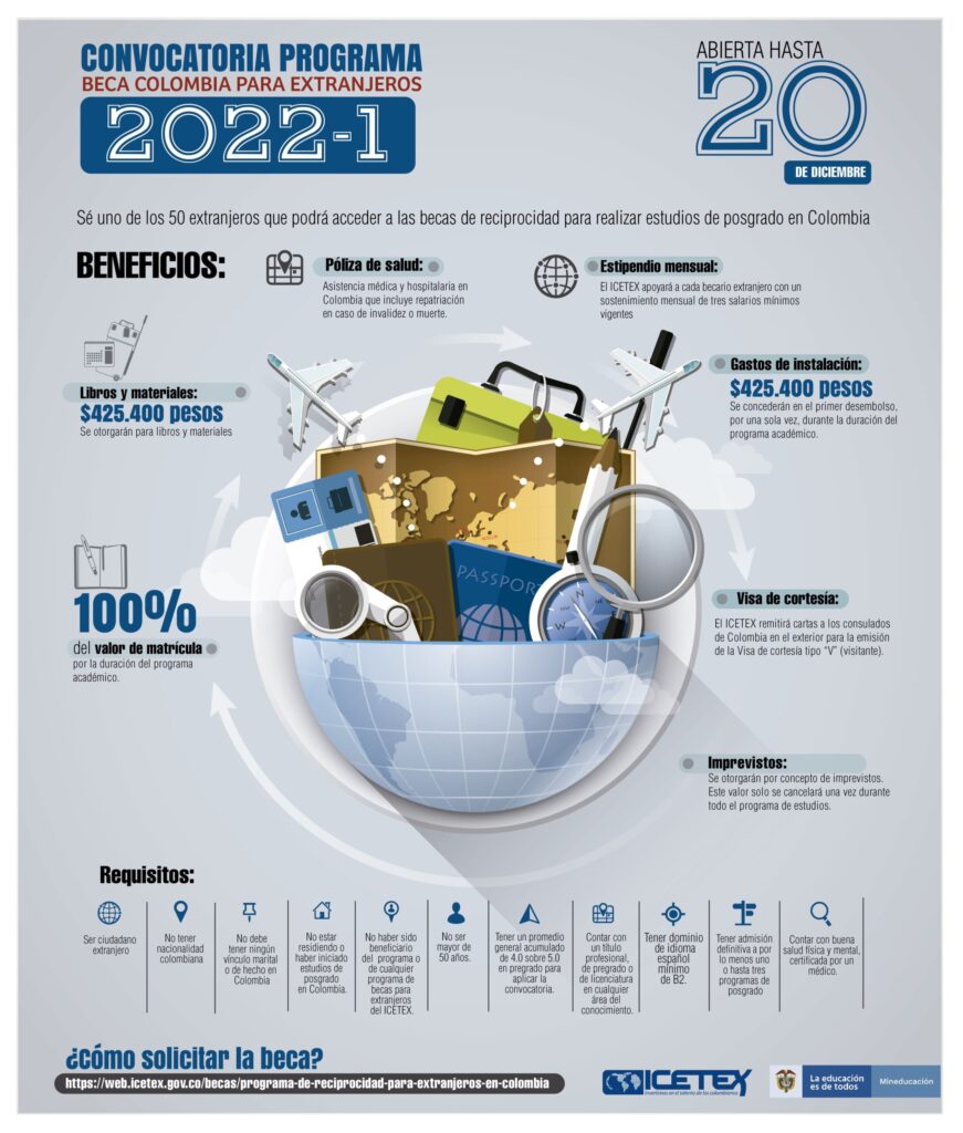 La convocatoria 2022-1 del Programa de Reciprocidad para Extranjeros Beca Colombia, estará abierta hasta el próximo 20 de diciembre de 2021.