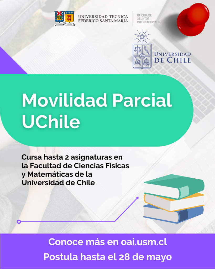 Hasta el martes 28 de mayo, 14:00 horas, se encuentra abierta la convocatoria para Movilidad Parcial con la Facultad de Ciencias Físicas y Matemáticas de la Universidad de Chile (UChile). Los estudiantes que resulten seleccionados podrán cursar hasta 2 asignaturas durante el segundo semestre de 2024, mientras siguen con sus cursos USM.