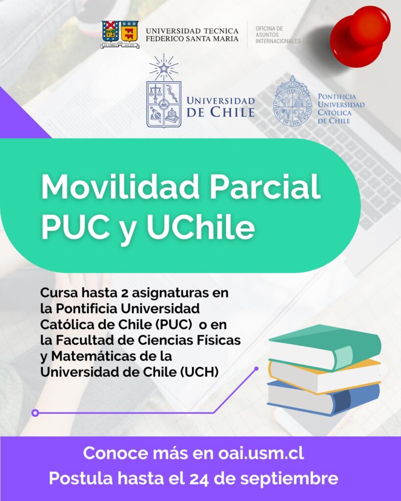 Hasta el NUEVO PLAZO: lunes 2 de octubre se encuentra abierta la convocatoria para Movilidad Parcial. Los estudiantes que resulten seleccionados podrán cursar hasta 2 asignaturas en la Pontifica Universidad Católica de Chile (PUC)o en la Facultad de Ciencias Físicas y Matemáticas de la Universidad de Chile (UChile), mientras siguen con sus cursos USM.