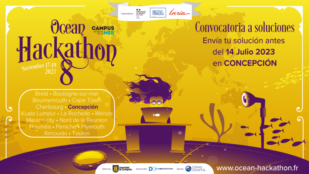 Ocean Hackathon convoca a equipos multidisciplinarios del ecosistema científico-tecnológico a desarrollar soluciones digitales para resolver desafíos vinculados a los océanos y a la comunidad marítima. Esta competencia es organizada anualmente en Chile por la Embajada de Francia en Chile, el Instituto Francés de Chile e Inria Chile, y para la edición 2023 se suman a la organización local la Universidad de Concepción y el centro COPAS Coastal, con datos provistos por el Data Observatory.